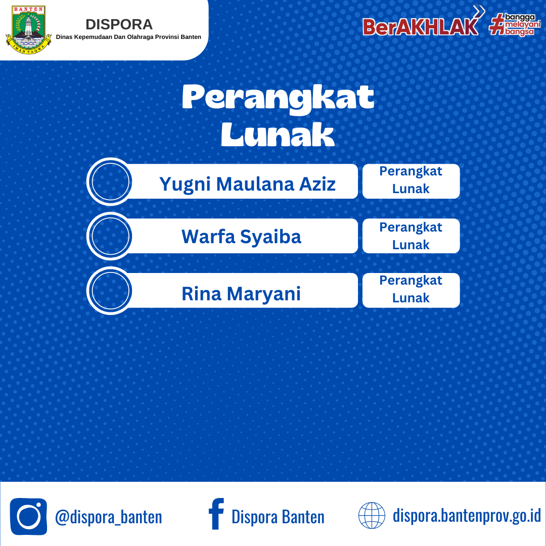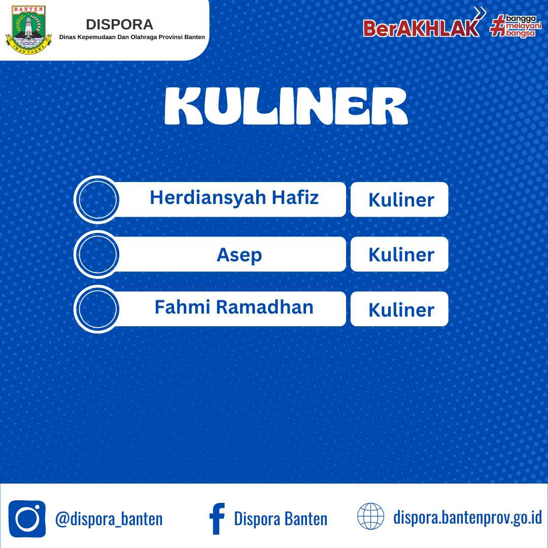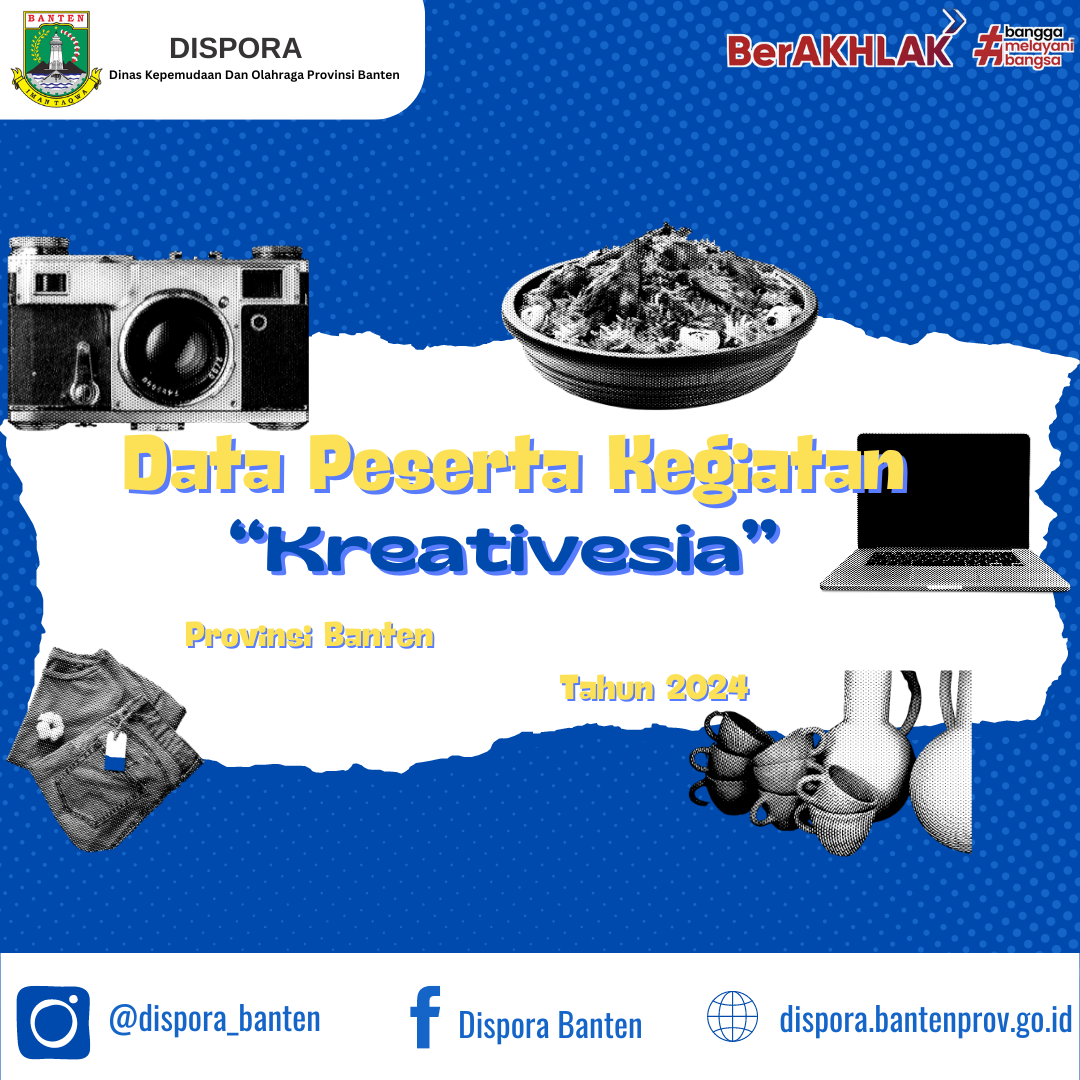 Menunjuk surat Dinas Kepemudaan dan Olahraga Provinsi Banten Nomor : 400.5/531-Dispora/2024 tanggal 28 Juni 2024 Perihal Penyampaian Seleksi Kegiatan Kreativesia 2024, bersama ini terlampir disampaikan peserta yang akan mengikuti kegiatan seleksi Kreativesia Provinsi Banten Tahun 2024 yang akan dilaksanakan pada tangga; 1 - 3 Agustus 2024 bertempat di Hotel Aston Serang, Registrasi Pukul 08.00 - 09.00 WIB (Berkas administrasi diserahkan pada saat registrasi), selanjutnya peserta yang dinyatakan lulus dapat mempersiapkan diri dan membawa kelengkapan sebagai berikut :