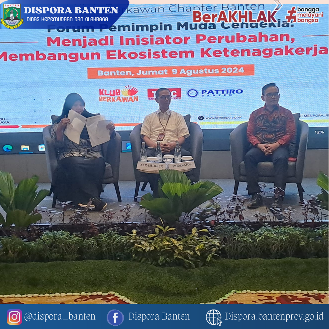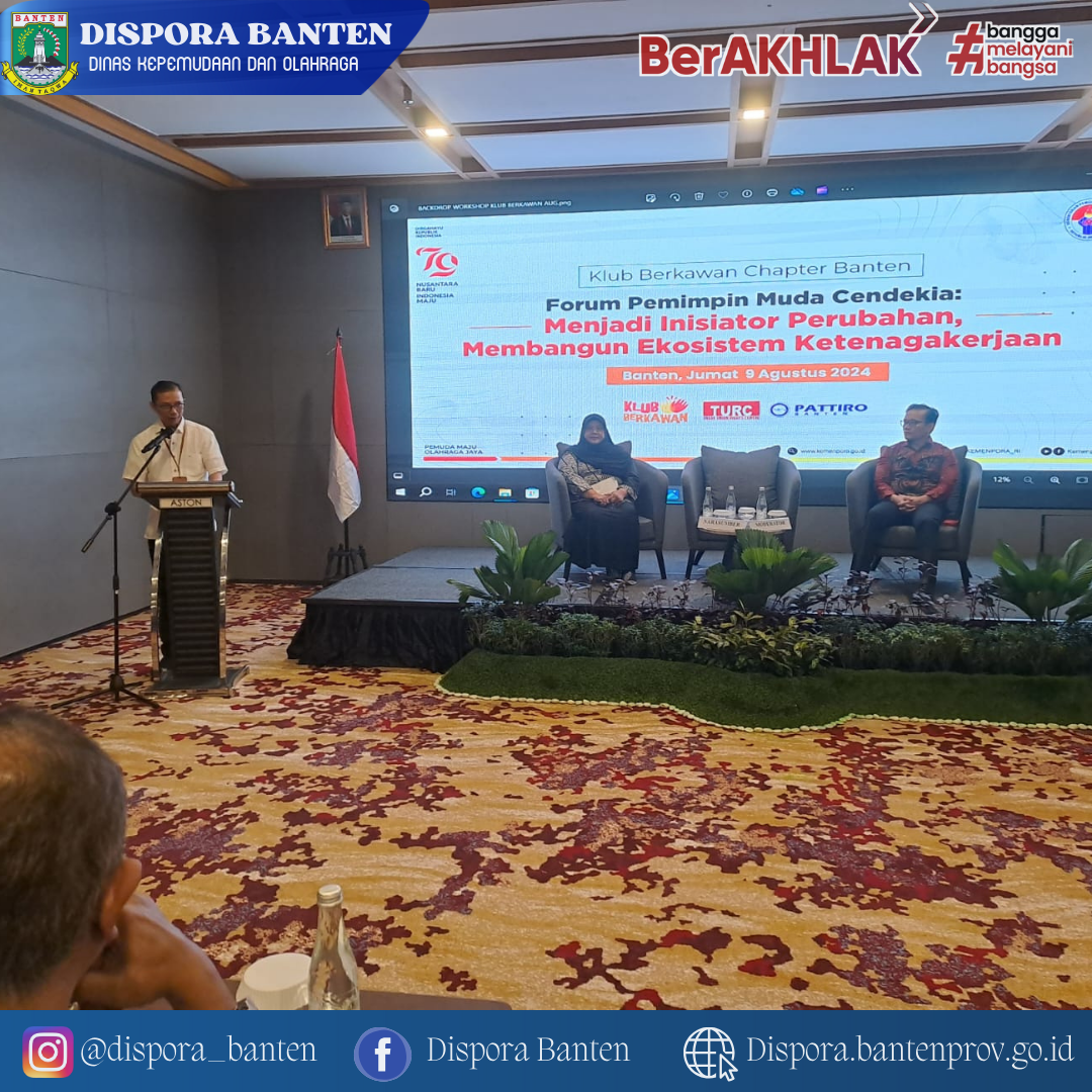 Kepala Dinas Kepemudaan dan Olahraga Provinsi Banten, Dr. H. Ahmad Syaukani, M. Si membuka Kegiatan Forum Pimpinan Muda Cendekia Yang Bertema Menjadi Inisiator Perubahan, Bangun Ekosistem Ketenagakerjaan. Kegiatan ini merupakan kolaborasi kegiatan antara Dinas Kepemudaan dan Olahraga Provinsi Banten dengan Asisten Deputi Kepemimpinan, Deputi Pengembangan Pemuda – Kemenpora RI. Peserta kegiatan merupakan perwakilan dari berbagai elemen kepemudaan, seperti BEM, OKP dan lainnya.